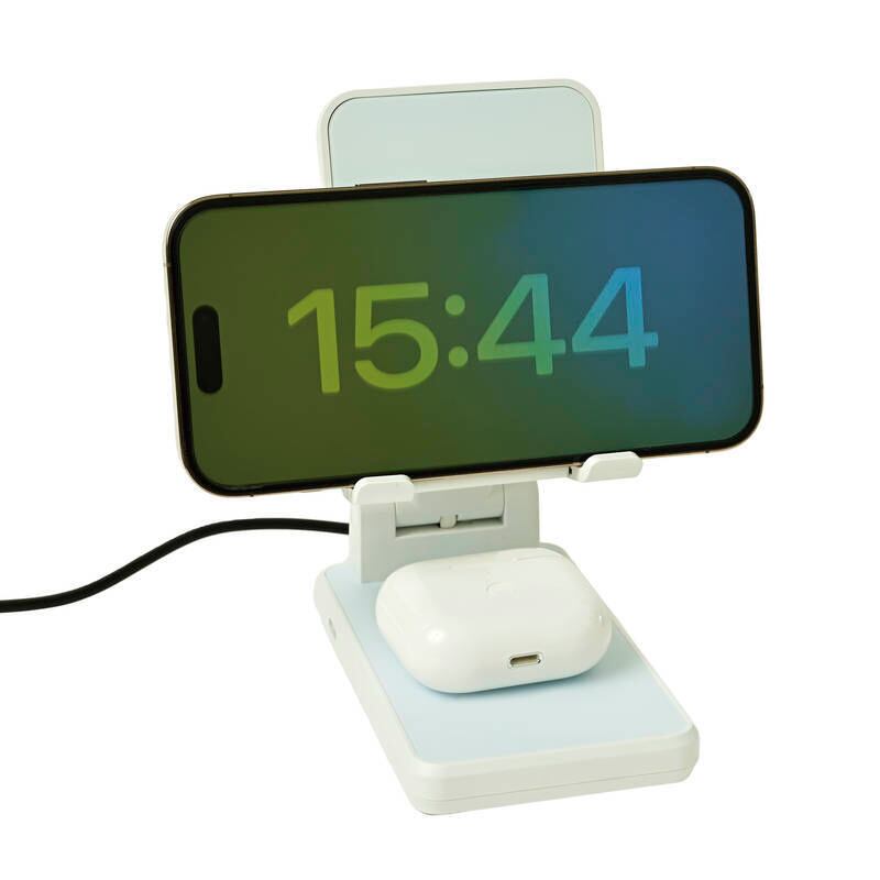 ・ワイヤレス充電対応機種の同時充電可能・スマホは最大15W出力ワイヤレス充電、縦・横置き充電可能・左右側面にType-CとUSB-A出力ポート搭載・スタンドは昇降式で角度調節可能・折り畳み式