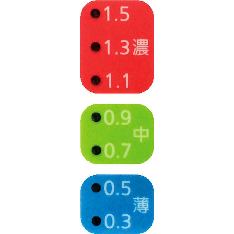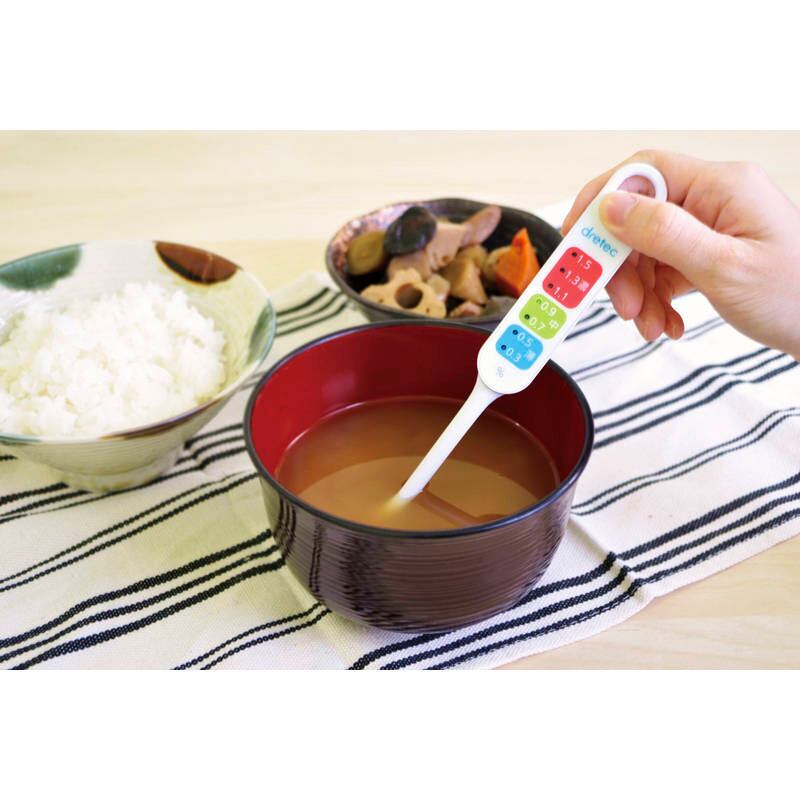 塩分濃度が濃すぎです。水などを足して濃度を調節してください。ちょうどよい塩分濃度です。塩分濃度が薄いです。塩分が少なく、味が薄く感じます。※青ランプが点滅している場合は0.3%以下を表しています。塩分の取り過ぎ予防に! 濃度を光ってお知らせ。・塩分濃度(0.3%~1.5%)を3色のLEDで濃い・中・薄いを7点表示・測定可能な液体温度/0℃~90℃・吊り下げられるフック穴付