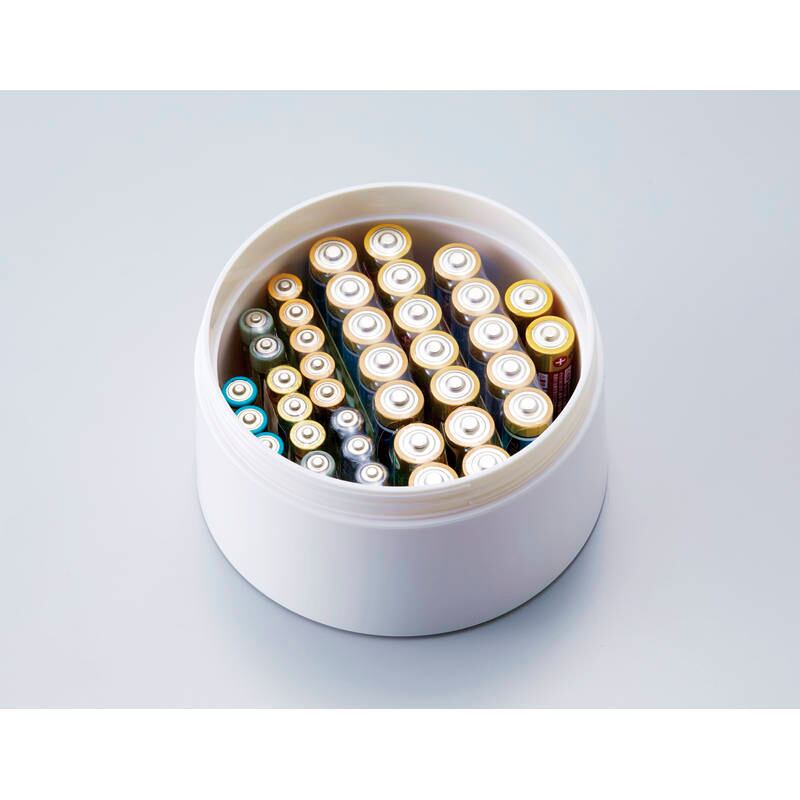 もしもの時に役立つ単3形と単4形乾電池が収納できる多機能ケース。スライドスイッチでモード切替可能。1.電池残量を測るチェッカー機能、2.LEDで周りを優しく照らすランタン機能、3.スマートフォン充電機能(簡易充電)、4.乾電池収納機能(単3形乾電池が21本と単4形乾電池が19本同時に収納可能) 電池残量とLED点灯は単3形でも単4形でも使用可能。(電池別売)※簡易充電機能を使用する際はお手持ちの純正ケーブルをご使用ください。