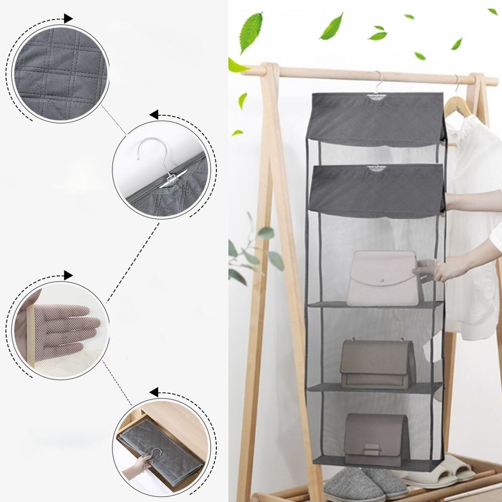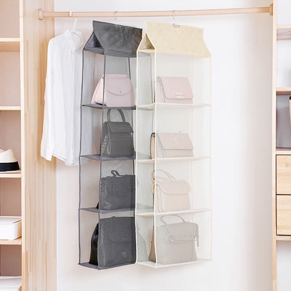 吊り下げ式なので、クローゼットなどのスペースを有効活用し、多層収納できるバッグ収納ハンガー