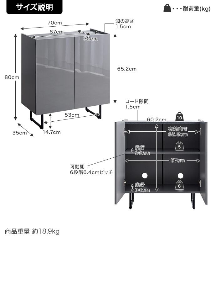 【耐荷重】天板:約10kg 、可動棚:約5kg、底板:約6kg