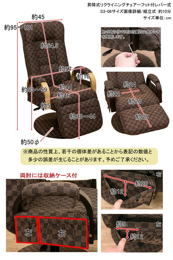 昇降式 リクライニングチェア チェア フット付き レバー式 BR 背もたれ レバー操作 リクライニング(11段階) レバーを引いて調節 フット部分 手動 調節可能(5段階) | Kuturogi0116