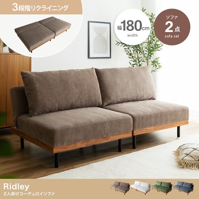 【2点セット】Ridley リクライニング コーデュロイ ソファ 2人掛け 木目柄 アイアン 異素材MIX 味わい深い