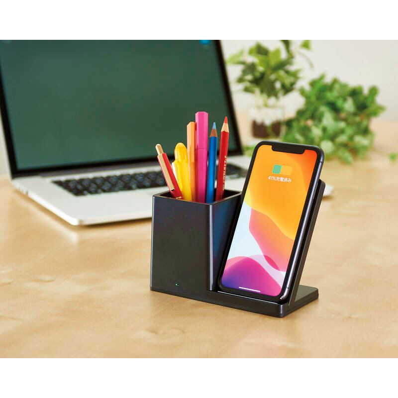 qi対応のスマートフォンを置くだけで充電ができる便利なペンホルダーの付いたワイヤレス充電器です。背面にはUSBポートが1つ付いており、最大2台同時に充電も可能です。
