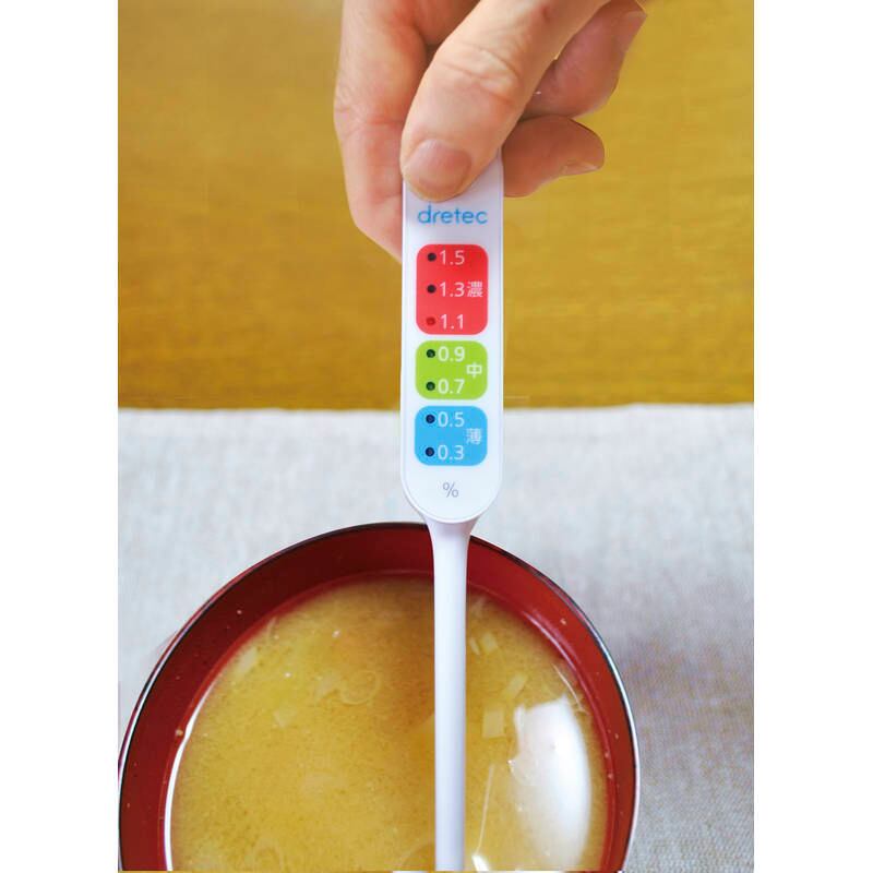 塩分濃度が濃すぎです。水などを足して濃度を調節してください。ちょうどよい塩分濃度です。塩分濃度が薄いです。塩分が少なく、味が薄く感じます。※青ランプが点滅している場合は0.3%以下を表しています。塩分の取り過ぎ予防に! 濃度を光ってお知らせ。・塩分濃度(0.3%~1.5%)を3色のLEDで濃い・中・薄いを7点表示・測定可能な液体温度/0℃~90℃・吊り下げられるフック穴付